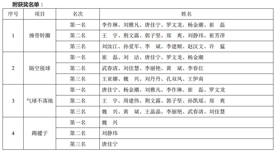 朗朗的歌聲之后, 大家投入到游戲當(dāng)中,在三個(gè)團(tuán)體項(xiàng)目(纏帶轉(zhuǎn)圈、 隔空接球、氣球不落地)和一個(gè)單人項(xiàng)目(踢毽子)游戲中,大家表現(xiàn)的十分熱情, 充分提現(xiàn)了員工們積極向上的精神面貌。