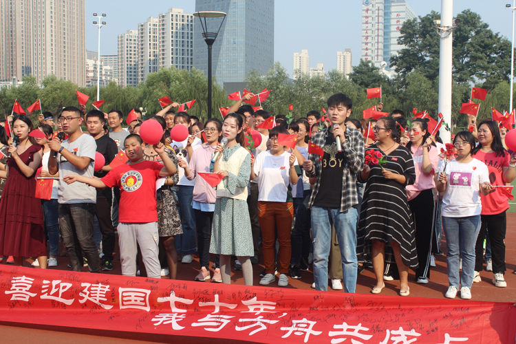 接著,大家在主席臺前集合,齊聲合唱《我和我的祖國》,大家一邊興奮地?fù)u動著手中的小紅旗,一邊動情地唱著歌,深情的歌聲和大家興奮的臉龐相應(yīng)和,充分表現(xiàn)出了員工們對祖國的熱愛。